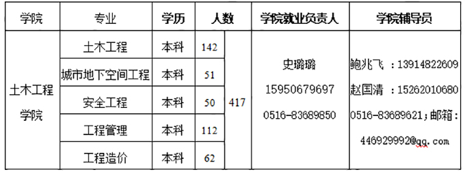 目前,我省正處于疫情防控和復工復產并重階段,隨著復工復產工作的穩步有序推進,企業對人才需求將進一步加大,為滿足我省建筑行業企業對充實工程建設一線人才的需求,徐州工程學院土木工程學院為建筑行業提供了包含土木工程、城市地下空間工程、安全工程、工程管理、工程造價等五個專業400多名優質一線人才資源。