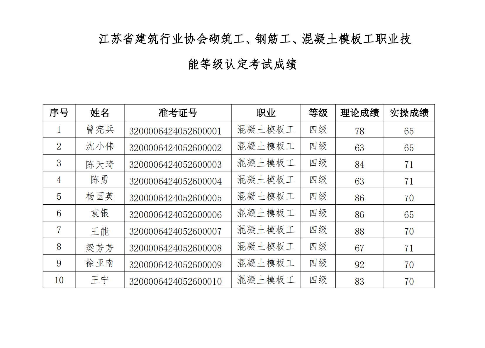 現將2024年5月26日江蘇省建筑行業協會砌筑工、鋼筋工、混凝土模板工職業技能等級認定(考試批次號為:2024-32000064-0006)考試成績公示如下,公示期5天,如有疑問,請聯系025-86380362。