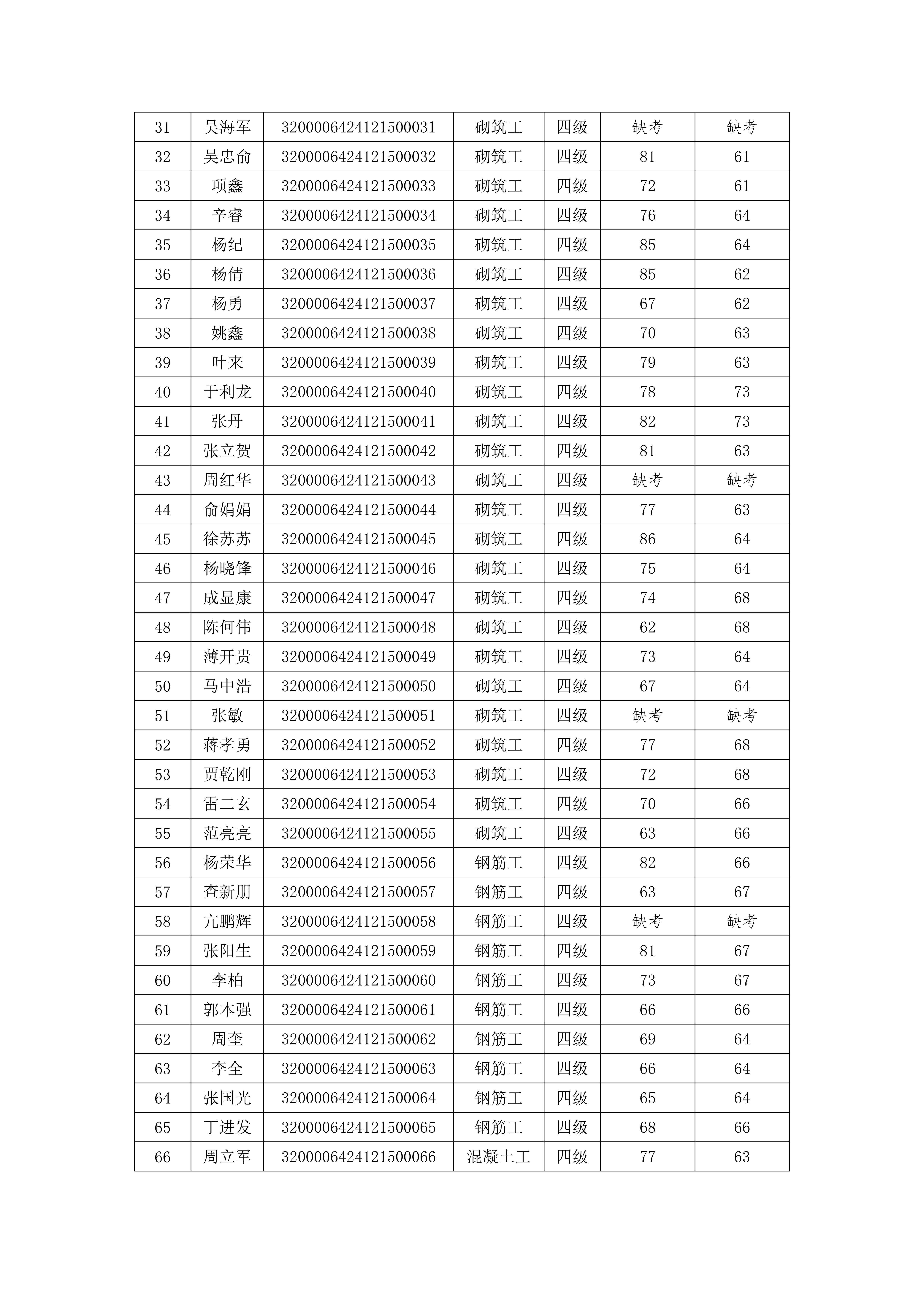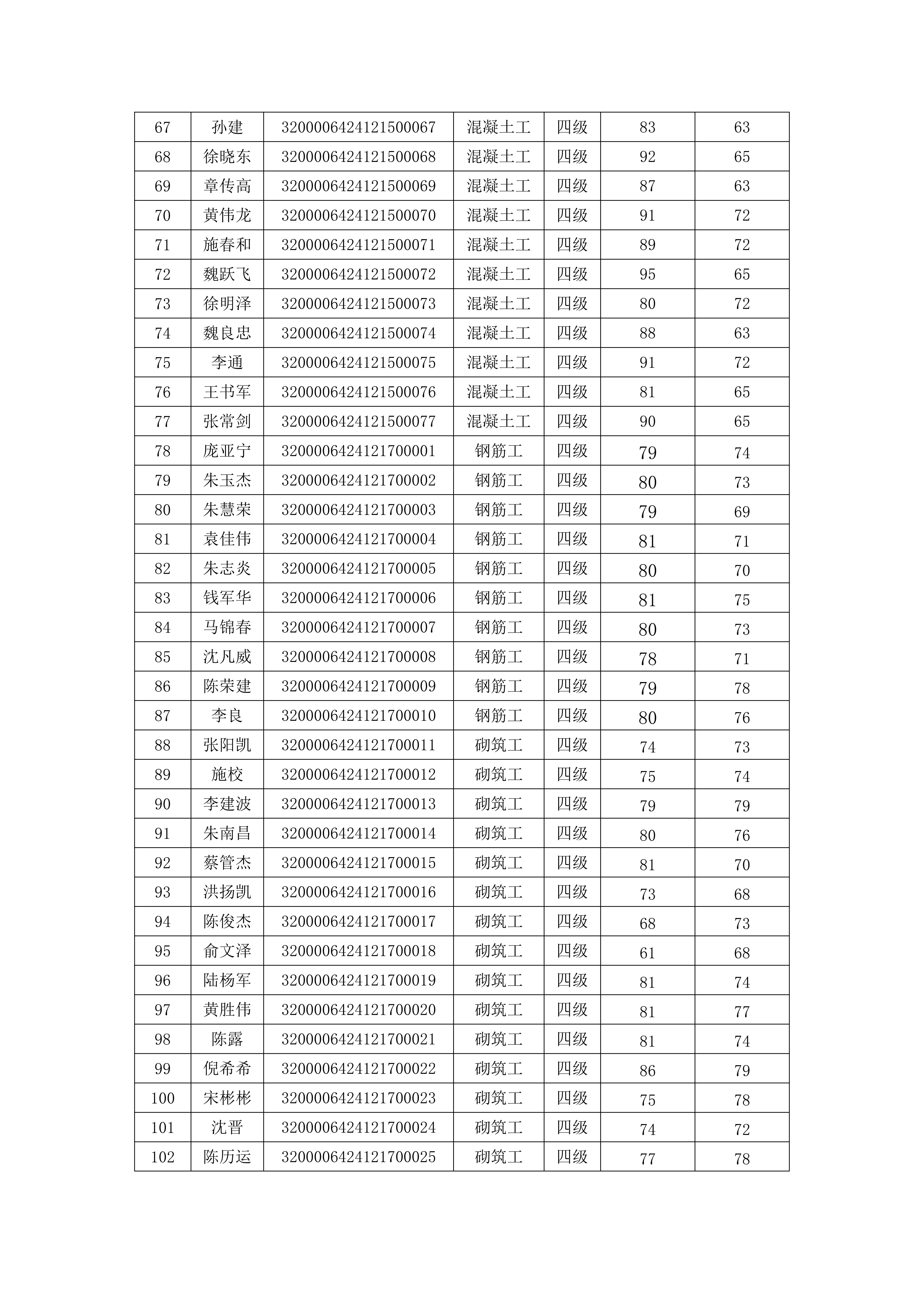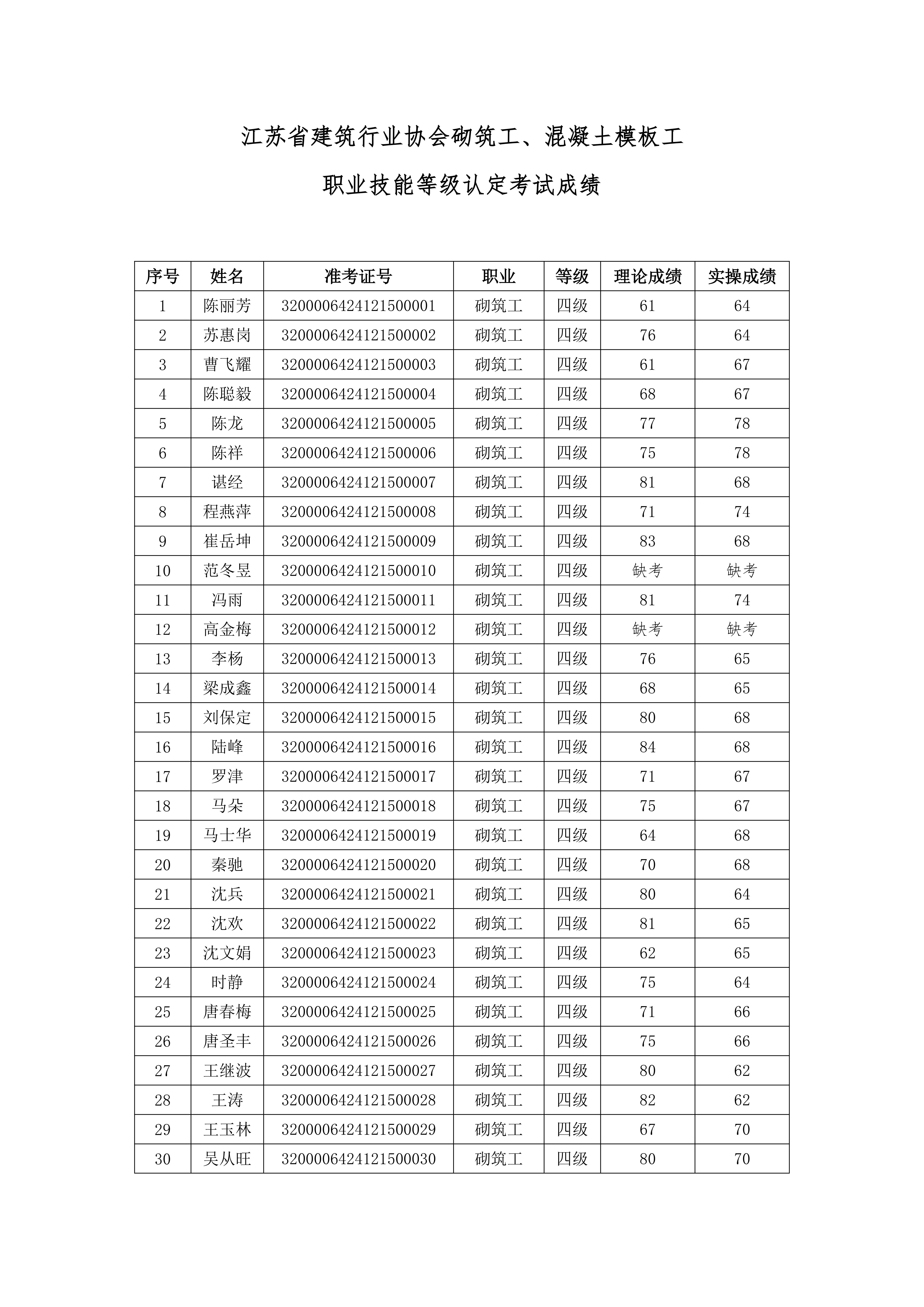我會于2024年12月15日、12月17日、12月22日組織開展了三批次砌筑工、鋼筋工、混凝土模板工職業技能等級認定(認定批次號:2024-32000064-0016、0017、0018),現將考試成績公示如下,公示期5天。