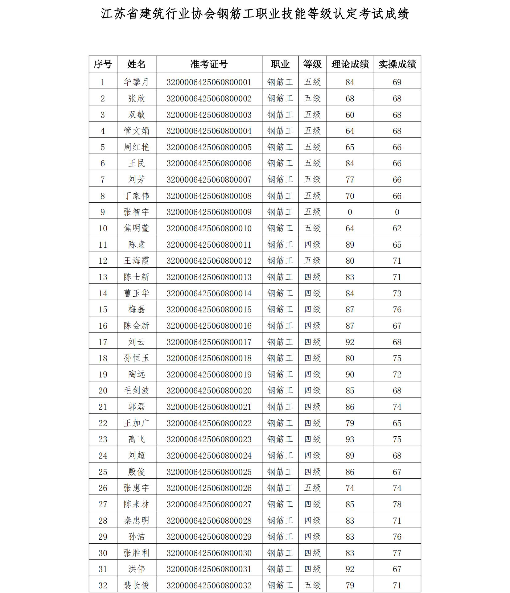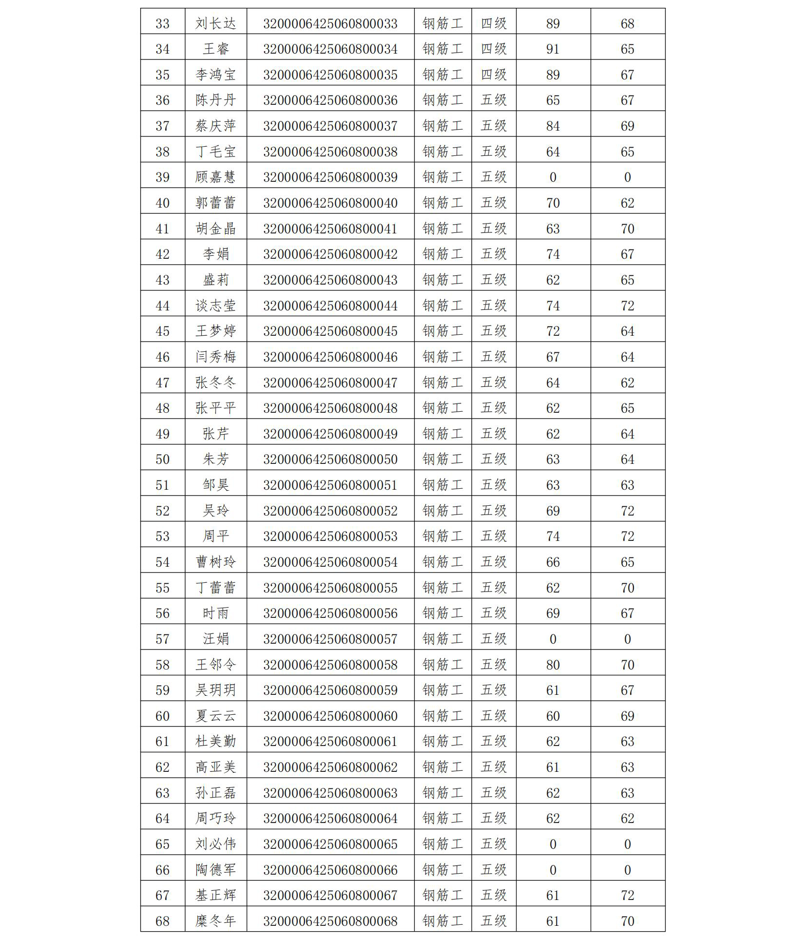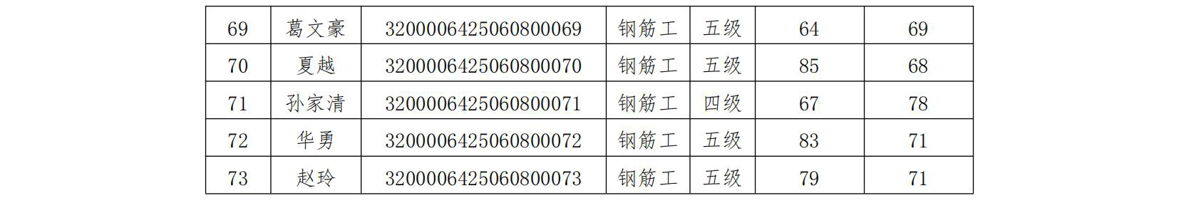 我會于2025年6月8日組織開展了鋼筋工四級、五級職業(yè)技能等級認定(認定批次號:2025-32000064-00010),現將考試成績公示如下,公示期5天。
